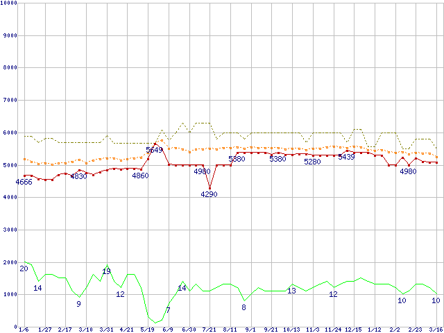 ※このグラフは過去のデータも税率5%相当に調整した税込み相当額のグラフです。 税率変更や、総額表示方式導入(2004年4月)の影響は除いています。 | | | ●凡例 | 最安値 (点線部は販売店未確認 または未調査) | 平均値 | 最高値 | ショップ数 |