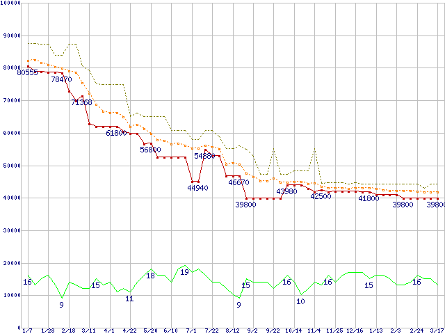 | Athlon 64 4000+ (2.4GHz,L2 1MB)の価格推移 | | | (2005年1月7日~2006年3月17日) |