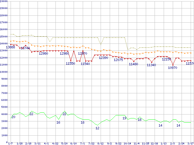 ※このグラフは過去のデータも税率5%相当に調整した税込み相当額のグラフです。 税率変更や、総額表示方式導入(2004年4月)の影響は除いています。 | | | ●凡例 | 最安値 (点線部は販売店未確認 または未調査) | 平均値 | 最高値 | ショップ数 |