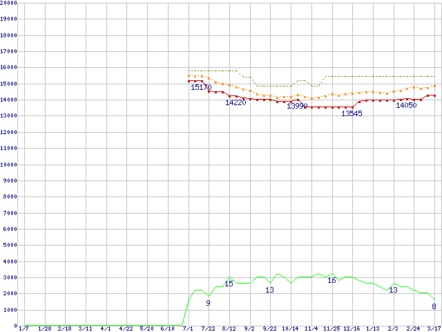 ※このグラフは過去のデータも税率5%相当に調整した税込み相当額のグラフです。 税率変更や、総額表示方式導入(2004年4月)の影響は除いています。 | | | ●凡例 | 最安値 (点線部は販売店未確認 または未調査) | 平均値 | 最高値 | ショップ数 |