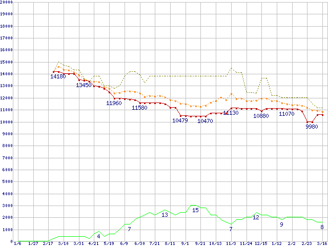 ※このグラフは過去のデータも税率5%相当に調整した税込み相当額のグラフです。 税率変更や、総額表示方式導入(2004年4月)の影響は除いています。 | | | ●凡例 | 最安値 (点線部は販売店未確認 または未調査) | 平均値 | 最高値 | ショップ数 |
