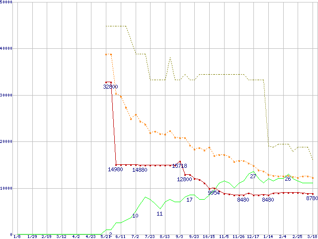 ※このグラフは過去のデータも税率5%相当に調整した税込み相当額のグラフです。 税率変更や、総額表示方式導入(2004年4月)の影響は除いています。 | | | ●凡例 | 最安値 (点線部は販売店未確認 または未調査) | 平均値 | 最高値 | ショップ数 |
