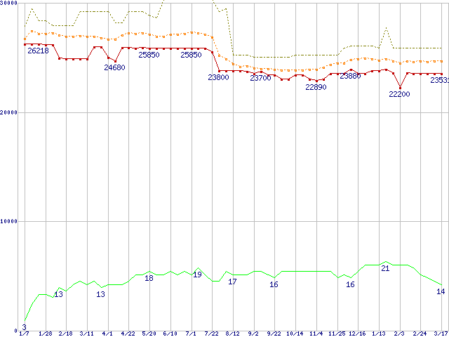 ※このグラフは過去のデータも税率5%相当に調整した税込み相当額のグラフです。 税率変更や、総額表示方式導入(2004年4月)の影響は除いています。 | | | ●凡例 | 最安値 (点線部は販売店未確認 または未調査) | 平均値 | 最高値 | ショップ数 |