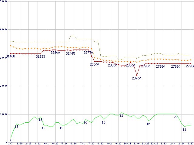 ※このグラフは過去のデータも税率5%相当に調整した税込み相当額のグラフです。 税率変更や、総額表示方式導入(2004年4月)の影響は除いています。 | | | ●凡例 | 最安値 (点線部は販売店未確認 または未調査) | 平均値 | 最高値 | ショップ数 |