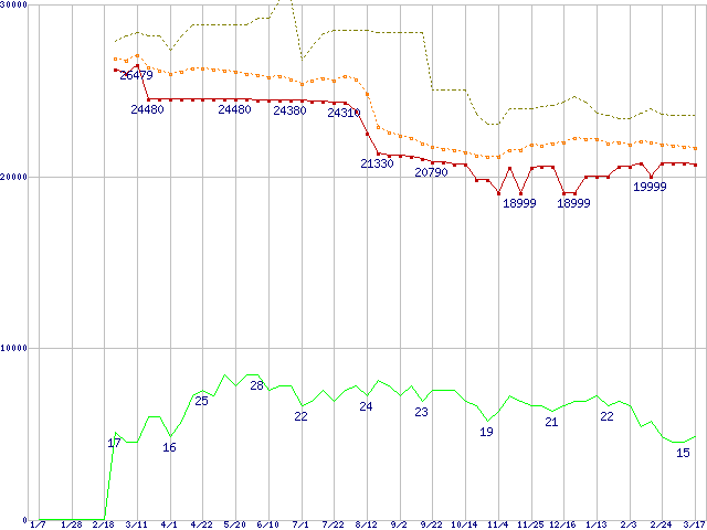 ※このグラフは過去のデータも税率5%相当に調整した税込み相当額のグラフです。 税率変更や、総額表示方式導入(2004年4月)の影響は除いています。 | | | ●凡例 | 最安値 (点線部は販売店未確認 または未調査) | 平均値 | 最高値 | ショップ数 |