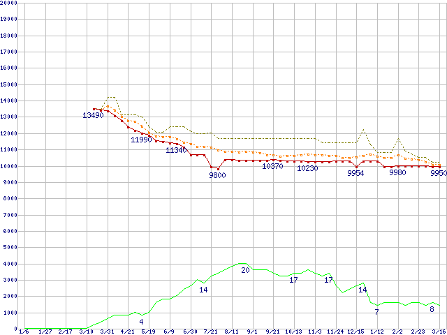 ※このグラフは過去のデータも税率5%相当に調整した税込み相当額のグラフです。 税率変更や、総額表示方式導入(2004年4月)の影響は除いています。 | | | ●凡例 | 最安値 (点線部は販売店未確認 または未調査) | 平均値 | 最高値 | ショップ数 |