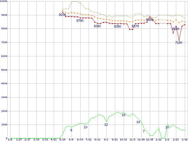 ※このグラフは過去のデータも税率5%相当に調整した税込み相当額のグラフです。 税率変更や、総額表示方式導入(2004年4月)の影響は除いています。 | | | ●凡例 | 最安値 (点線部は販売店未確認 または未調査) | 平均値 | 最高値 | ショップ数 |