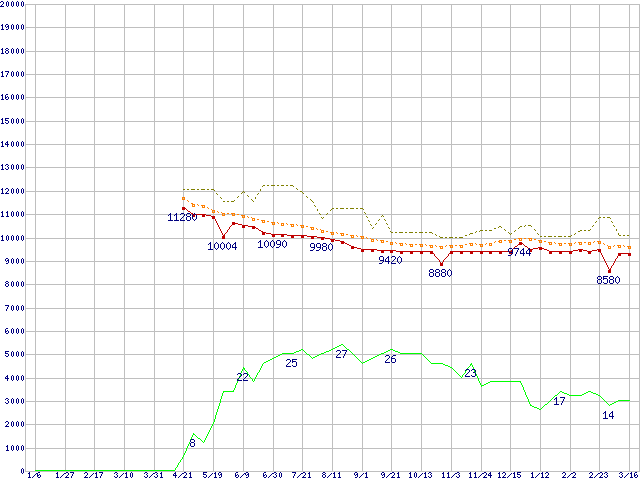 ※このグラフは過去のデータも税率5%相当に調整した税込み相当額のグラフです。 税率変更や、総額表示方式導入(2004年4月)の影響は除いています。 | | | ●凡例 | 最安値 (点線部は販売店未確認 または未調査) | 平均値 | 最高値 | ショップ数 |