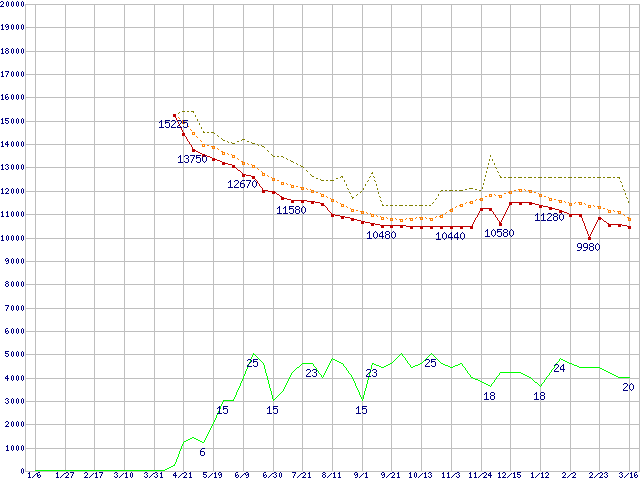 ※このグラフは過去のデータも税率5%相当に調整した税込み相当額のグラフです。 税率変更や、総額表示方式導入(2004年4月)の影響は除いています。 | | | ●凡例 | 最安値 (点線部は販売店未確認 または未調査) | 平均値 | 最高値 | ショップ数 |