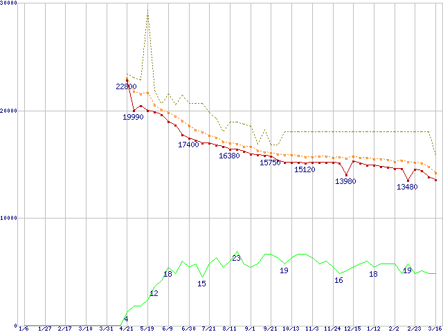 ※このグラフは過去のデータも税率5%相当に調整した税込み相当額のグラフです。 税率変更や、総額表示方式導入(2004年4月)の影響は除いています。 | | | ●凡例 | 最安値 (点線部は販売店未確認 または未調査) | 平均値 | 最高値 | ショップ数 |