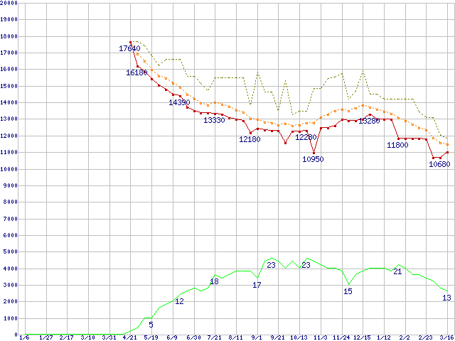 ※このグラフは過去のデータも税率5%相当に調整した税込み相当額のグラフです。 税率変更や、総額表示方式導入(2004年4月)の影響は除いています。 | | | ●凡例 | 最安値 (点線部は販売店未確認 または未調査) | 平均値 | 最高値 | ショップ数 |