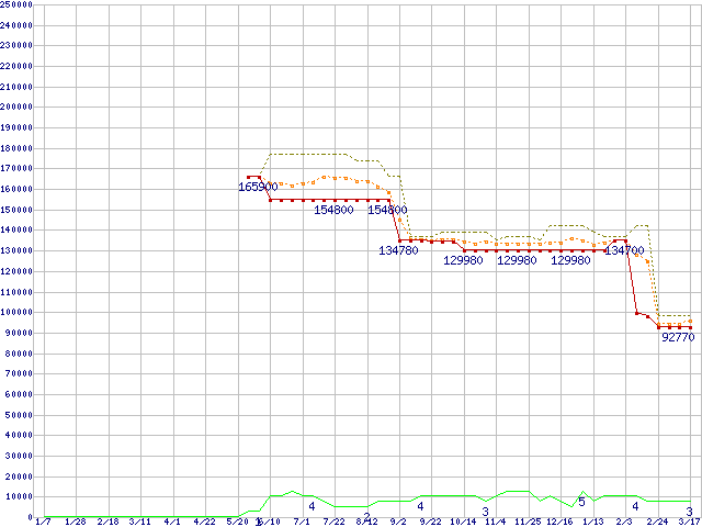 ※このグラフは過去のデータも税率5%相当に調整した税込み相当額のグラフです。 税率変更や、総額表示方式導入(2004年4月)の影響は除いています。 | | | ●凡例 | 最安値 (点線部は販売店未確認 または未調査) | 平均値 | 最高値 | ショップ数 |