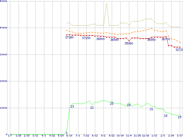 ※このグラフは過去のデータも税率5%相当に調整した税込み相当額のグラフです。 税率変更や、総額表示方式導入(2004年4月)の影響は除いています。 | | | ●凡例 | 最安値 (点線部は販売店未確認 または未調査) | 平均値 | 最高値 | ショップ数 |