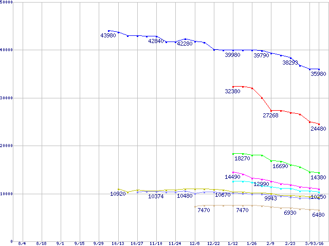 | Barracuda 7200.9 (7200rpm,Serial ATA II/3Gbps)の最安値推移 | | | (2005年8月4日~2006年3月16日) |