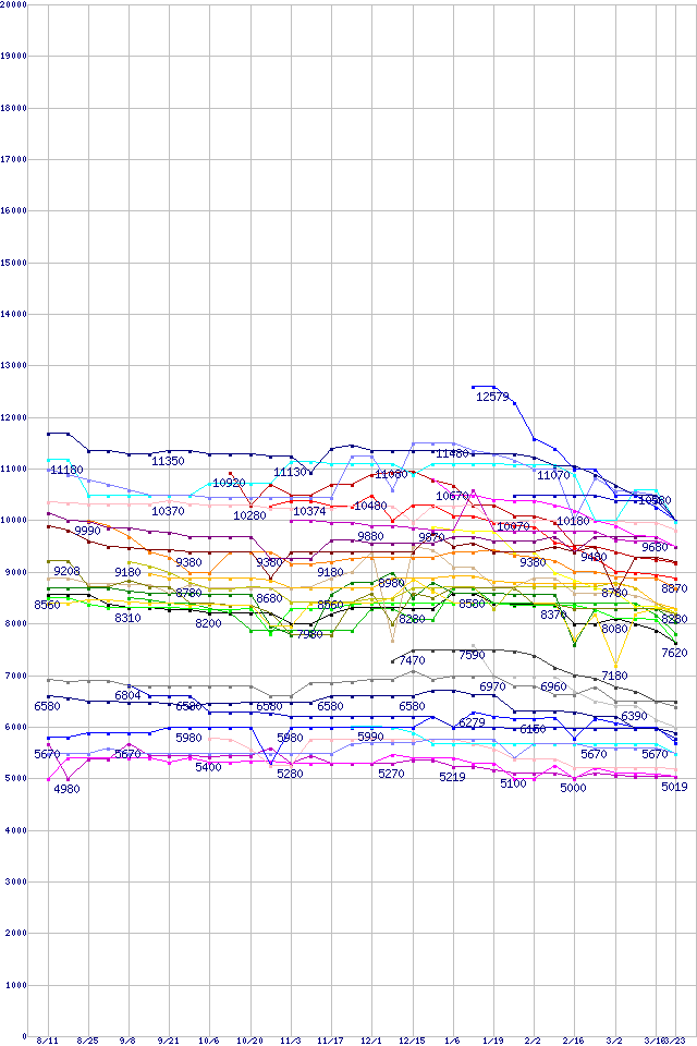 | HDD主要製品(最安値1万円未満)の最安値推移 | | | (2005年8月11日~2006年3月23日) |