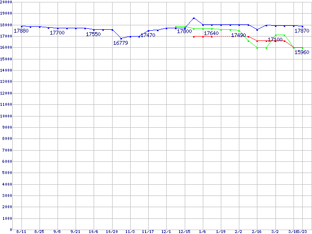 HDD主要製品(最安値1万5千円~2万円未満)の最安値推移