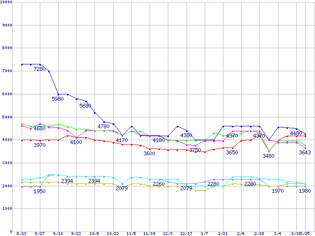 メモリ主要製品(最安値5千円~1万円未満)の最安値推移