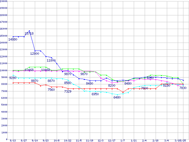 メモリ主要製品(最安値1万円以上)の最安値推移