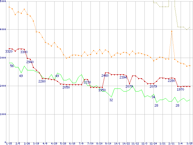 ※このグラフは過去のデータも税率5%相当に調整した税込み相当額のグラフです。 税率変更や、総額表示方式導入(2004年4月)の影響は除いています。 | | | ●凡例 | 最安値 (点線部は販売店未確認 または未調査) | 平均値 | 最高値 | ショップ数 |