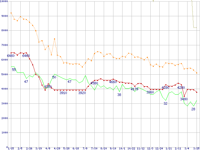 ※このグラフは過去のデータも税率5%相当に調整した税込み相当額のグラフです。 税率変更や、総額表示方式導入(2004年4月)の影響は除いています。 | | | ●凡例 | 最安値 (点線部は販売店未確認 または未調査) | 平均値 | 最高値 | ショップ数 |