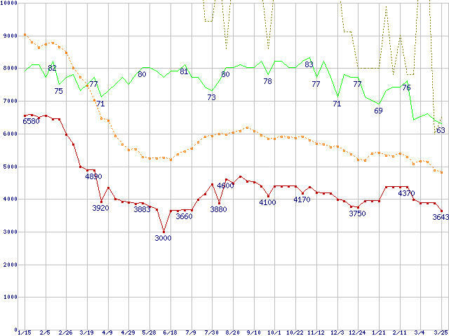 ※このグラフは過去のデータも税率5%相当に調整した税込み相当額のグラフです。 税率変更や、総額表示方式導入(2004年4月)の影響は除いています。 | | | ●凡例 | 最安値 (点線部は販売店未確認 または未調査) | 平均値 | 最高値 | ショップ数 |