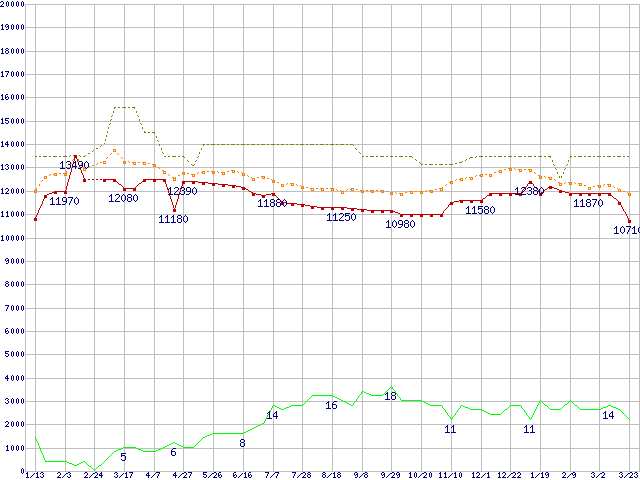 ※このグラフは過去のデータも税率5%相当に調整した税込み相当額のグラフです。 税率変更や、総額表示方式導入(2004年4月)の影響は除いています。 | | | ●凡例 | 最安値 (点線部は販売店未確認 または未調査) | 平均値 | 最高値 | ショップ数 |