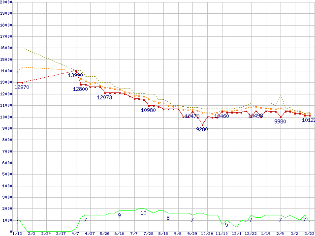 ※このグラフは過去のデータも税率5%相当に調整した税込み相当額のグラフです。 税率変更や、総額表示方式導入(2004年4月)の影響は除いています。 | | | ●凡例 | 最安値 (点線部は販売店未確認 または未調査) | 平均値 | 最高値 | ショップ数 |