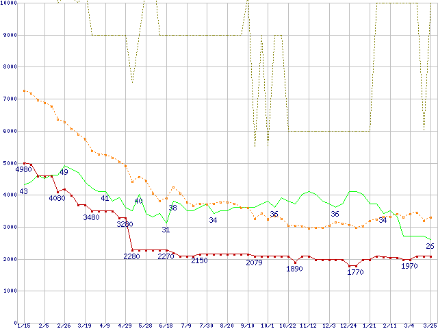 ※このグラフは過去のデータも税率5%相当に調整した税込み相当額のグラフです。 税率変更や、総額表示方式導入(2004年4月)の影響は除いています。 | | | ●凡例 | 最安値 (点線部は販売店未確認 または未調査) | 平均値 | 最高値 | ショップ数 |