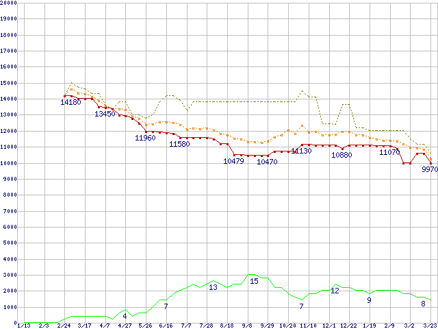※このグラフは過去のデータも税率5%相当に調整した税込み相当額のグラフです。 税率変更や、総額表示方式導入(2004年4月)の影響は除いています。 | | | ●凡例 | 最安値 (点線部は販売店未確認 または未調査) | 平均値 | 最高値 | ショップ数 |