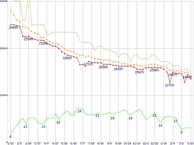 ※このグラフは過去のデータも税率5%相当に調整した税込み相当額のグラフです。 税率変更や、総額表示方式導入(2004年4月)の影響は除いています。 | | | ●凡例 | 最安値 (点線部は販売店未確認 または未調査) | 平均値 | 最高値 | ショップ数 |