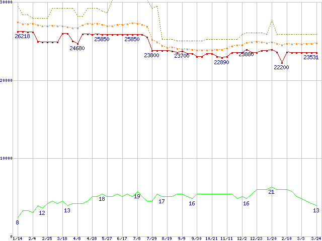 ※このグラフは過去のデータも税率5%相当に調整した税込み相当額のグラフです。 税率変更や、総額表示方式導入(2004年4月)の影響は除いています。 | | | ●凡例 | 最安値 (点線部は販売店未確認 または未調査) | 平均値 | 最高値 | ショップ数 |