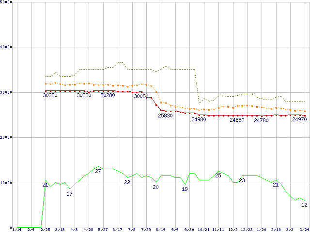 ※このグラフは過去のデータも税率5%相当に調整した税込み相当額のグラフです。 税率変更や、総額表示方式導入(2004年4月)の影響は除いています。 | | | ●凡例 | 最安値 (点線部は販売店未確認 または未調査) | 平均値 | 最高値 | ショップ数 |