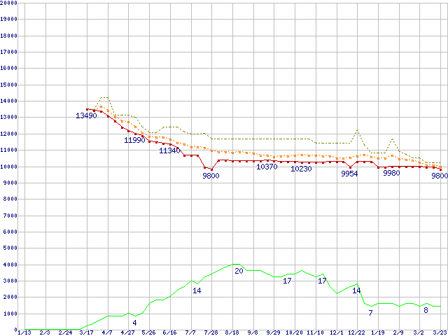 ※このグラフは過去のデータも税率5%相当に調整した税込み相当額のグラフです。 税率変更や、総額表示方式導入(2004年4月)の影響は除いています。 | | | ●凡例 | 最安値 (点線部は販売店未確認 または未調査) | 平均値 | 最高値 | ショップ数 |