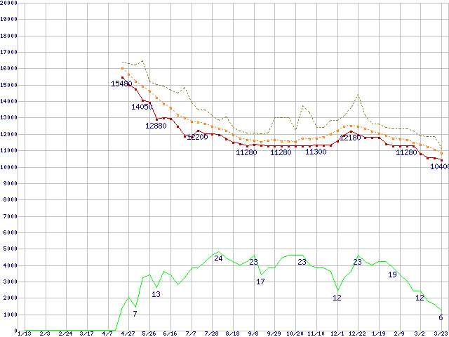 ※このグラフは過去のデータも税率5%相当に調整した税込み相当額のグラフです。 税率変更や、総額表示方式導入(2004年4月)の影響は除いています。 | | | ●凡例 | 最安値 (点線部は販売店未確認 または未調査) | 平均値 | 最高値 | ショップ数 |