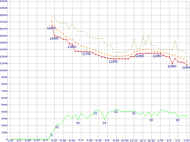 ※このグラフは過去のデータも税率5%相当に調整した税込み相当額のグラフです。 税率変更や、総額表示方式導入(2004年4月)の影響は除いています。 | | | ●凡例 | 最安値 (点線部は販売店未確認 または未調査) | 平均値 | 最高値 | ショップ数 |
