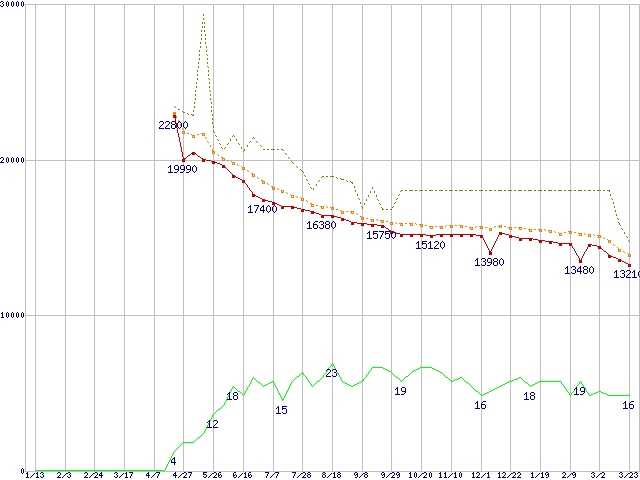 ※このグラフは過去のデータも税率5%相当に調整した税込み相当額のグラフです。 税率変更や、総額表示方式導入(2004年4月)の影響は除いています。 | | | ●凡例 | 最安値 (点線部は販売店未確認 または未調査) | 平均値 | 最高値 | ショップ数 |