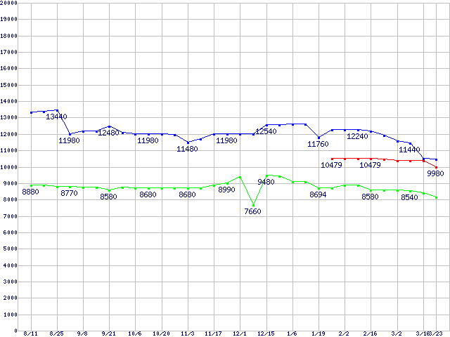 | Deskstar T7K250 (7200rpm,Serial ATA II/3Gbps)の最安値推移 | | | (2005年8月11日~2006年3月23日) |