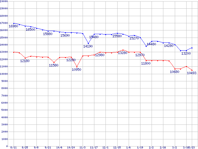| MaXLine III (7200rpm,16MB,Serial ATA II Phase1,RoHS指令準拠)の最安値推移 | | | (2005年8月11日~2006年3月23日) |