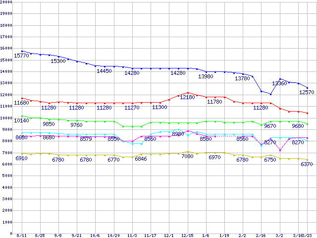 | DiamondMax 10 (7200rpm,Serial ATA II Phase1,RoHS指令準拠)の最安値推移 | | | (2005年8月11日~2006年3月23日) |