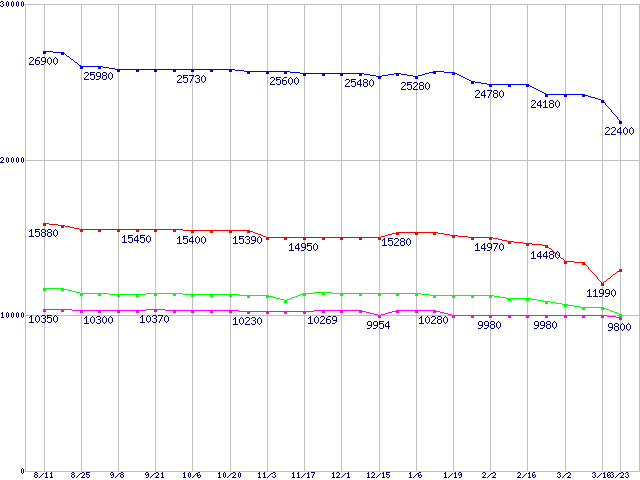 | Barracuda 7200.8 (7200rpm,Ultra ATA/100,8MB,133GB/Platter)の最安値推移 | | | (2005年8月11日~2006年3月23日) |