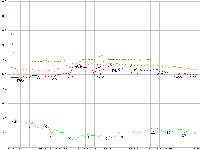 ※このグラフは過去のデータも税率5%相当に調整した税込み相当額のグラフです。 税率変更や、総額表示方式導入(2004年4月)の影響は除いています。 | | | ●凡例 | 最安値 (点線部は販売店未確認 または未調査) | 平均値 | 最高値 | ショップ数 |