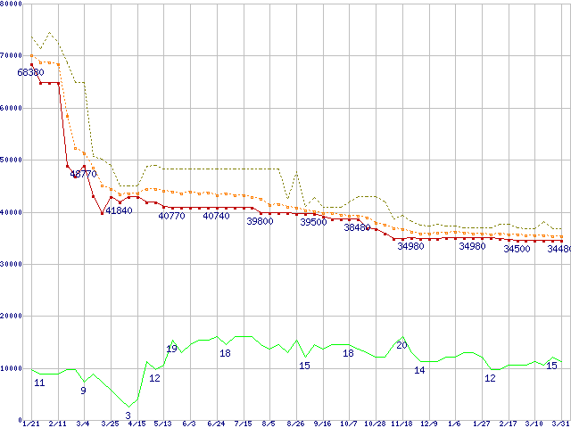 | Athlon 64 3800+ (2.4GHz,L2 512KB)の価格推移 | | | (2005年1月21日~2006年3月31日) |