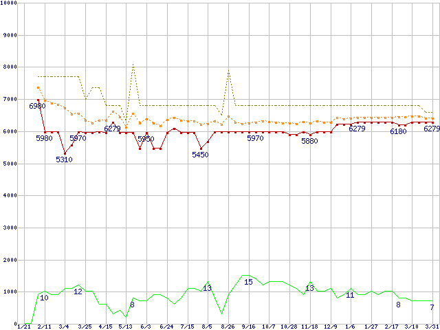 ※このグラフは過去のデータも税率5%相当に調整した税込み相当額のグラフです。 税率変更や、総額表示方式導入(2004年4月)の影響は除いています。 | | | ●凡例 | 最安値 (点線部は販売店未確認 または未調査) | 平均値 | 最高値 | ショップ数 |
