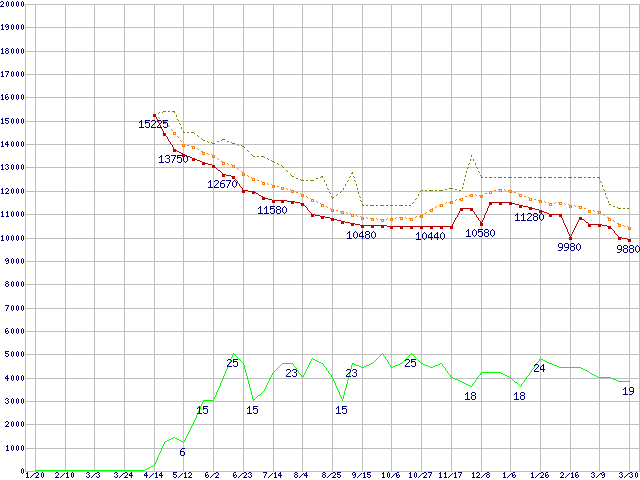 ※このグラフは過去のデータも税率5%相当に調整した税込み相当額のグラフです。 税率変更や、総額表示方式導入(2004年4月)の影響は除いています。 | | | ●凡例 | 最安値 (点線部は販売店未確認 または未調査) | 平均値 | 最高値 | ショップ数 |