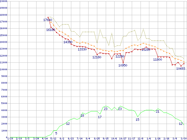 ※このグラフは過去のデータも税率5%相当に調整した税込み相当額のグラフです。 税率変更や、総額表示方式導入(2004年4月)の影響は除いています。 | | | ●凡例 | 最安値 (点線部は販売店未確認 または未調査) | 平均値 | 最高値 | ショップ数 |