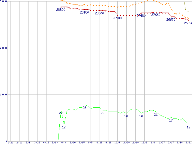 ※このグラフは過去のデータも税率5%相当に調整した税込み相当額のグラフです。 税率変更や、総額表示方式導入(2004年4月)の影響は除いています。 | | | ●凡例 | 最安値 (点線部は販売店未確認 または未調査) | 平均値 | 最高値 | ショップ数 |