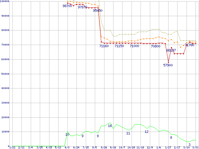 ※このグラフは過去のデータも税率5%相当に調整した税込み相当額のグラフです。 税率変更や、総額表示方式導入(2004年4月)の影響は除いています。 | | | ●凡例 | 最安値 (点線部は販売店未確認 または未調査) | 平均値 | 最高値 | ショップ数 |