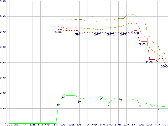 ※このグラフは過去のデータも税率5%相当に調整した税込み相当額のグラフです。 税率変更や、総額表示方式導入(2004年4月)の影響は除いています。 | | | ●凡例 | 最安値 (点線部は販売店未確認 または未調査) | 平均値 | 最高値 | ショップ数 |