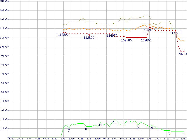 ※このグラフは過去のデータも税率5%相当に調整した税込み相当額のグラフです。 税率変更や、総額表示方式導入(2004年4月)の影響は除いています。 | | | ●凡例 | 最安値 (点線部は販売店未確認 または未調査) | 平均値 | 最高値 | ショップ数 |