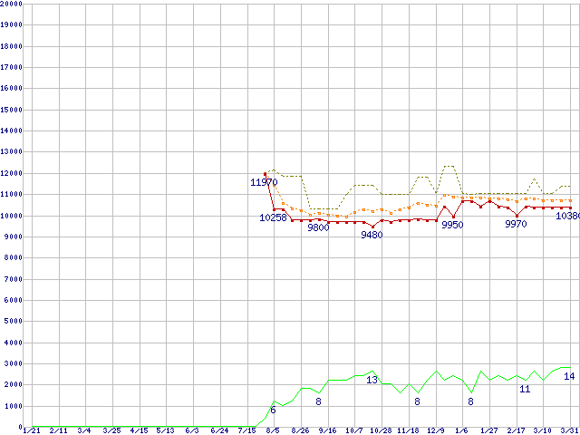 ※このグラフは過去のデータも税率5%相当に調整した税込み相当額のグラフです。 税率変更や、総額表示方式導入(2004年4月)の影響は除いています。 | | | ●凡例 | 最安値 (点線部は販売店未確認 または未調査) | 平均値 | 最高値 | ショップ数 |